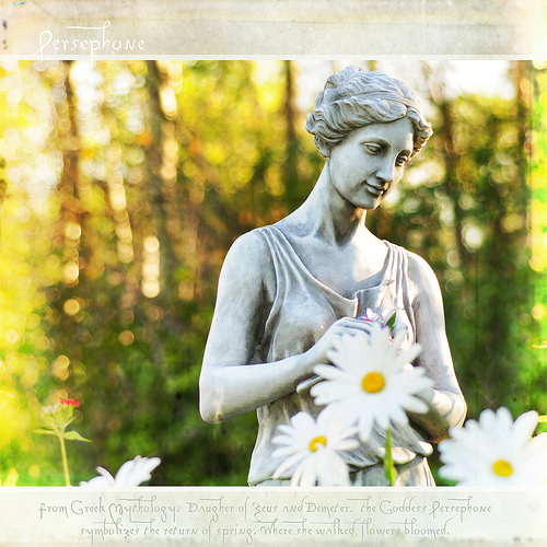 In Greek Mythology, Persephone is the daughter of Zeus (the head of all gods) and Demeter (the harvest/earth goddess). Persephone was a beautiful child and many gods asked for her hand in marriage. All were unsuccessful. Hades (god of the underworld) on a trip above ground, saw Persephone and subsequently kidnapped her. Demeter was distraught, understandably and she stopped tending the earth. Well, people and animals began to starve; a great famine descended on the earth.